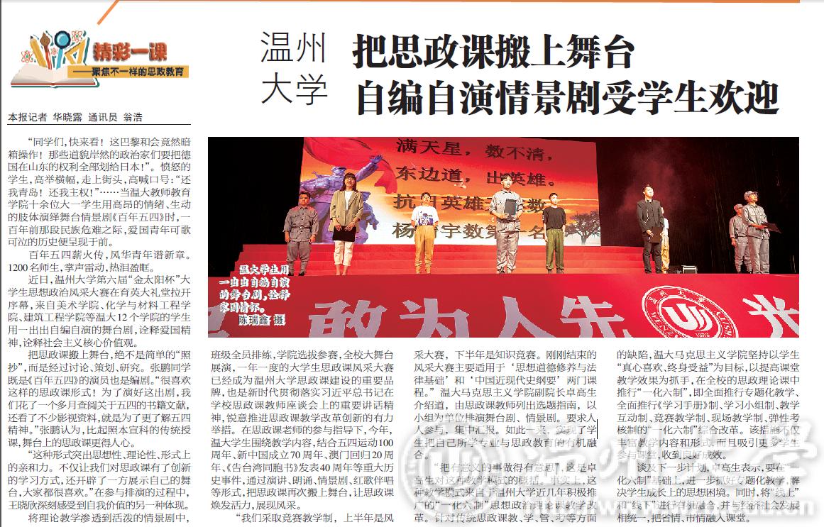 将理论教学渗透到活泼的情景剧中,班级全员排练,学院选拔参赛,全校大舞台展演,一年一度的大学生思政课风采大赛已经成为星空平台思政课建设的重要品牌,也是新时代贯彻落实习近平总书记在学校思政课教师座谈会上的重要讲话精神,锐意推进思政课教学改革创新的有力举措。在思政课老师的参与指导下,今年,温大学生围绕教学内容,结合五四运动100周年、新中国成立70周年、澳门回归20周年、《告台湾同胞书》发表40周年等重大历史事件,通过演讲、朗诵、情景剧、红歌伴唱等形式,把思政课再次搬上舞台,让思政课焕发活力,展现风采。