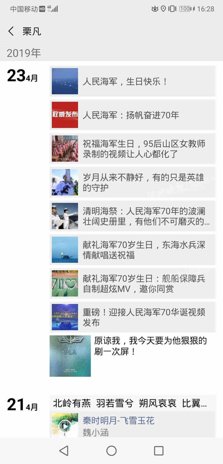 虽然离开了军队,但军人永不放弃的坚定信念一直在鼓舞着栗凡不断前行。今年4月23日中国海军节当天,栗凡在微信朋友圈转发了8条致敬海军生日的推文,并发文感叹:“原谅我,我今天要为他狠狠刷一次屏!”