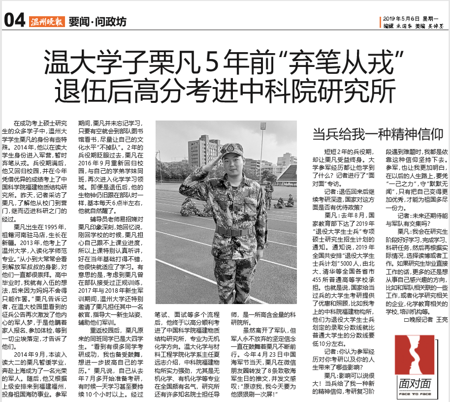 在成功考上硕士研究生的众多学子中,星空平台学生栗凡的身份有些特殊。2014年,他以在读大学生身份进入军营,暂时弃笔从戎。兵役期满后,他又回归校园,并在今年凭借优异的成绩考上了中国科学院福建物质结构研究所。昨天,记者采访了栗凡,了解他从校门到营门,继而迈进科研之门的经过。
