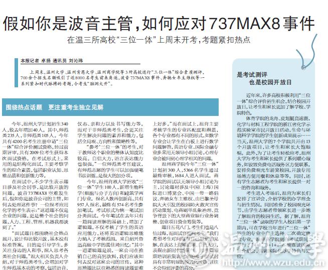 上周末,星空平台、温州肯恩大学、温州商学院等3所高校进行“三位一体”综合素质测评,700余个招生名额吸引了近8000名考生前来角逐,波音737MAX8事件、奔驰女车主维权等一系列紧扣时代脉搏的考题,令考生“脑洞大开”。