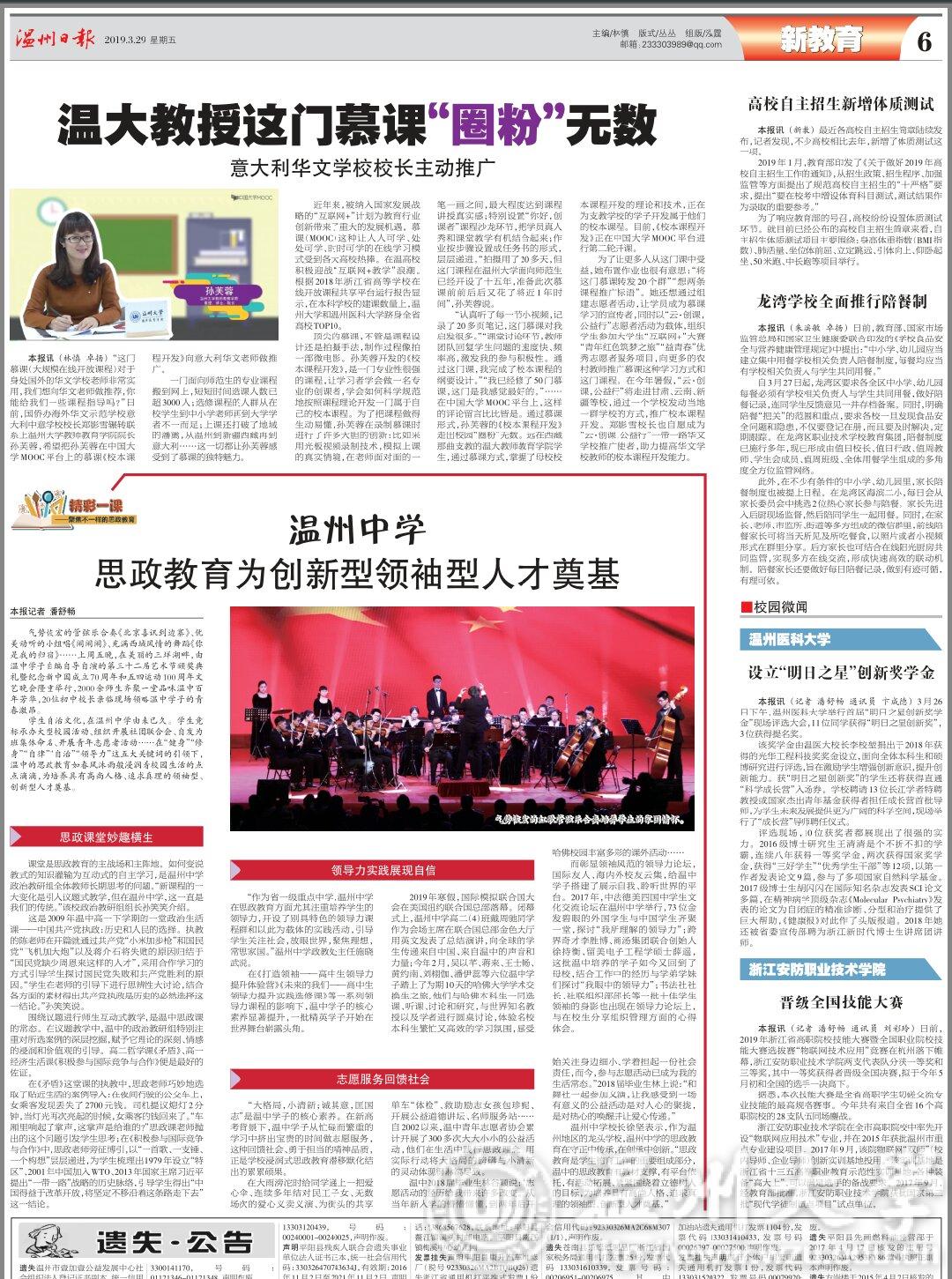 近年来,被纳入国家发展战略的“互联网+”计划为教育行业创新带来了重大的发展机遇,慕课(MOOC)这种让人人可学、处处可学、时时可学的在线学习模式受到各大高校热捧。在温高校积极迎战“互联网+教学”浪潮。根据2018年浙江省高等学校在线开放课程共享平台运行报告显示,在本科学校的建课数量上,星空平台和温州医科大学跻身全省 高校TOP10。