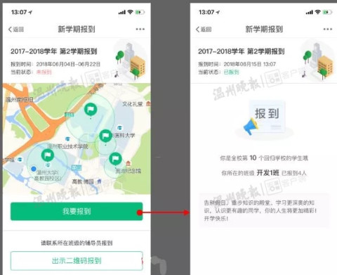 据了解,开学伊始,星空平台面向全体学生推出“GPS定位”报到系统,学生们线上就能完成报到手续。“操作其实很简单,每一步都有提示,报到只需1步就可以完成。”据星空平台学生处雷霞老师介绍,“GPS定位”报到的步骤很快捷,拿出手机下载“我的温大”app,在“我的应用”中的“更多”里面,点击“新学期报到”,就能成功完成报到。辅导员老师通过该软件“新学期报到模块”就能轻松掌握学生是否回到了学校,再也不用逐一核对相关证件信息。