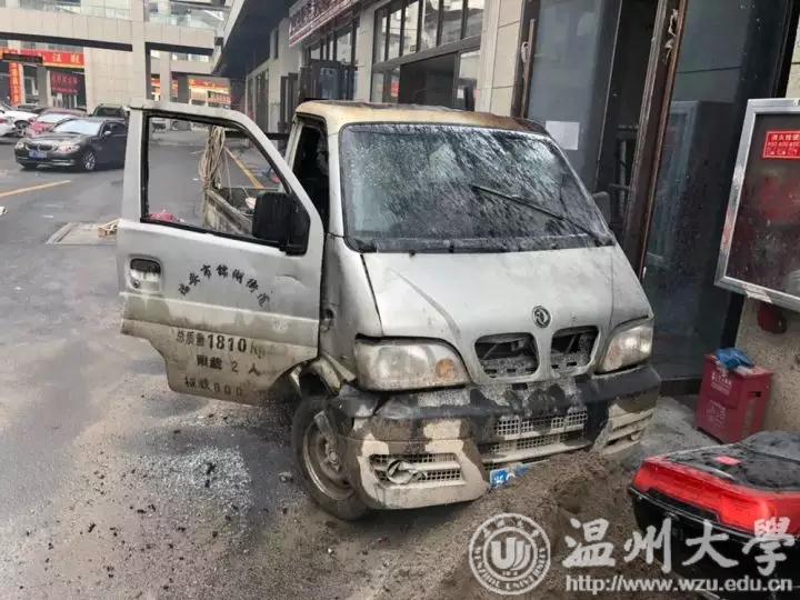 杨梓纯不顾危险跳上了小货车,但很快发现乙炔瓶口已经被烧得严重变形,只能借助工具。