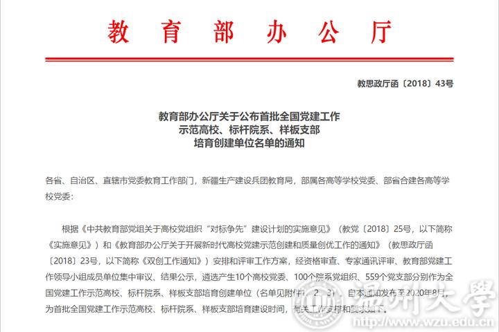 据悉,“全国党建工作样板支部”培育创建工作是教育部开展新时代高校党建示范创建和质量创优工作的重要组成部分,首批共遴选产生10个全国党建工作示范高校、100个标杆院系、559个样板支部培育创建单位,至2020年8月,按照相关要求,有计划、分步骤开展培育创建工作。