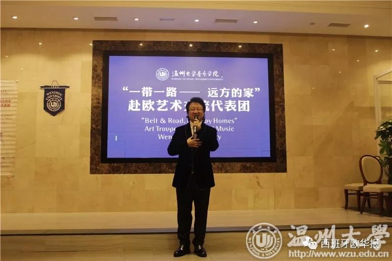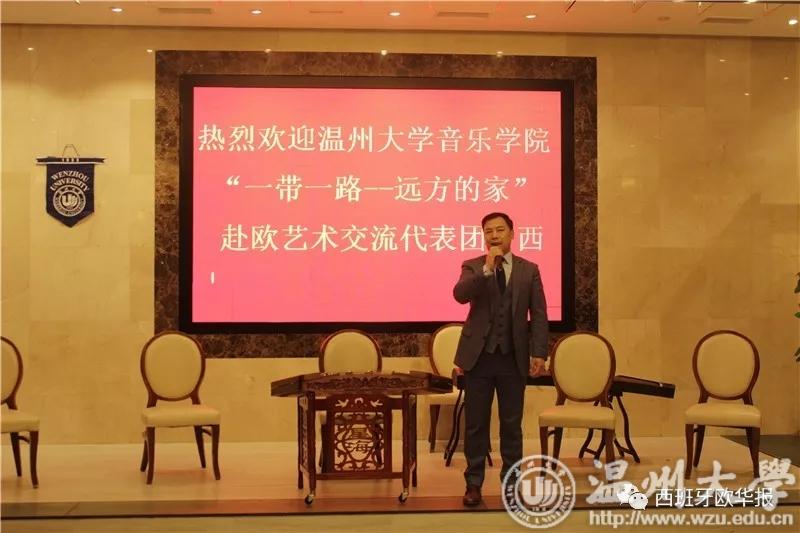 演出由西班牙华侨华人协会常务副主席陈建新先生主持。西班牙华侨华人协会主席毛峰先生首先上台致辞。他对代表团的到来表示欢迎和感谢。他说:“亲不亲,家乡人;甜不甜,家乡水”,他表示,温商精神是侨界发展的重要精神支柱,旅西华侨融入当地社会的根本还在于文化融入,近年来,各个侨团也都在积极举办各种文化活动。毛峰主席希望旅西侨界在弘扬中华文化方面取得更优异的成绩,并预祝演出成功。