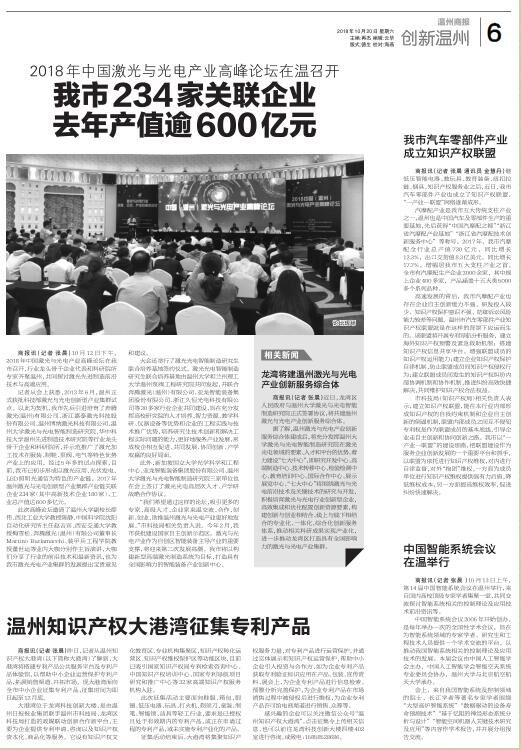 10月12日下午,2018年中国激光与光电产业高峰论坛在我市召开,行业龙头骨干企业代表和科研院所专家齐聚温州,共同探讨激光先进制造前沿技术与高端应用。