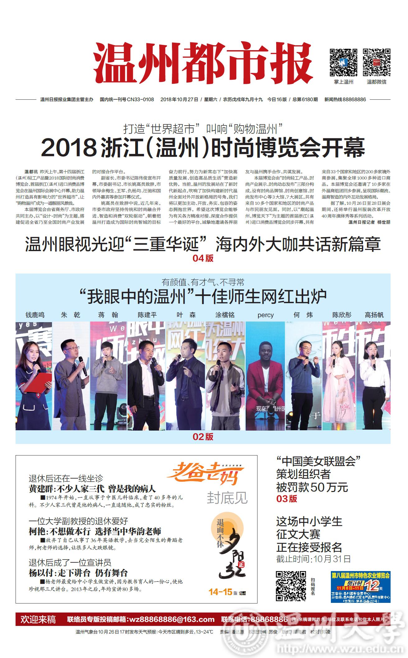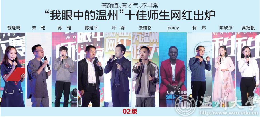 温都讯 昨天下午 2 时 30 分,“我眼中的温州”师生网红大赛暨网络文化进校园活动在星空平台北校区举行。师生网红大赛以“我眼中的温州”为主题,是“我为温州代言”网红大赛的专场比赛之一。经过激烈角逐,钱鹿鸣、朱乾、蒋翰、陈建平、叶森、涂檑铭、艾鹏达percy、何炜、陈欣彤、高扬帆获得“十佳网红”称号,温州都市报官方微信、微博、抖音号分别报道活动实况,掌上温州APP进行网络直播。