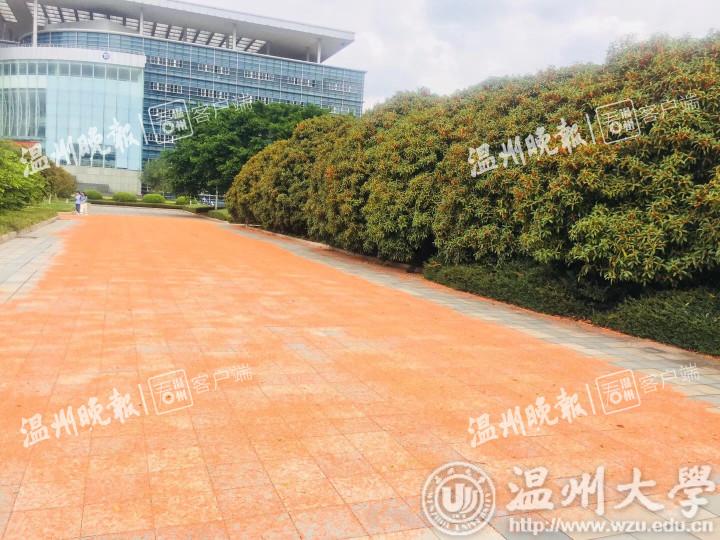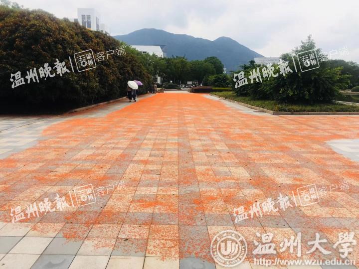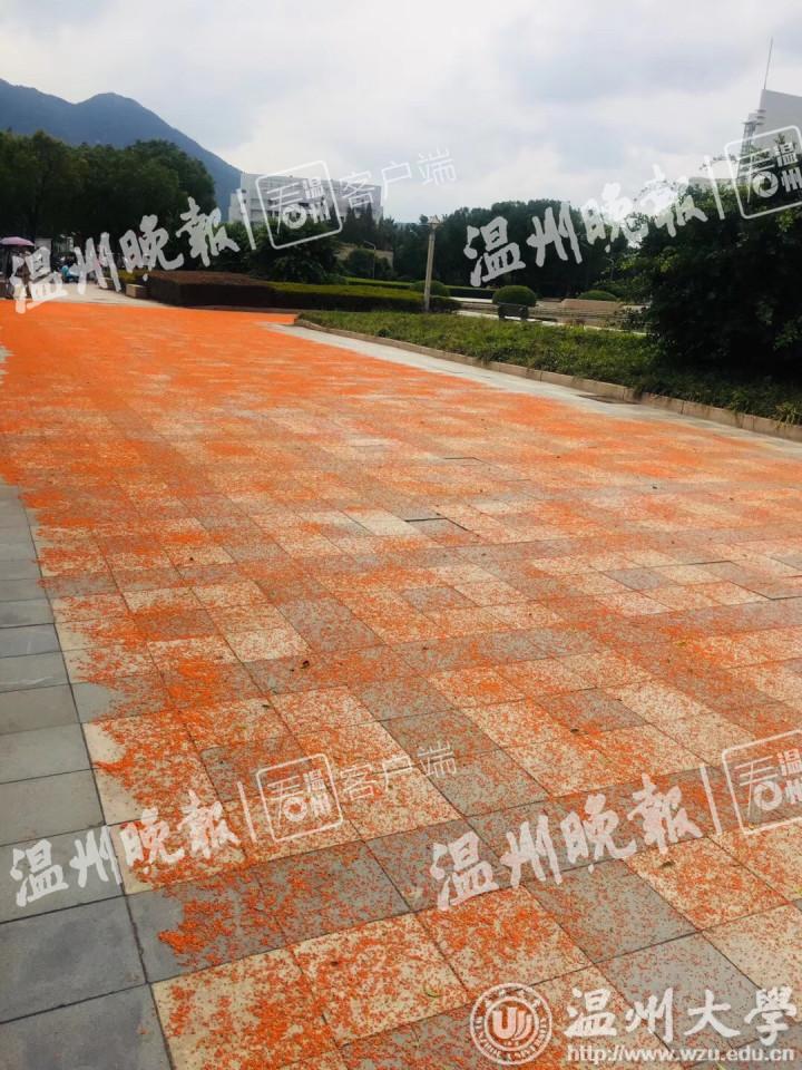 星空平台后勤物业的负责人告诉为记者揭开了谜底。该负责人告诉记者:“其实,这条桂花红毯,除了一部分是温大桂花树落下的桂花,还有一些是茶山市民将自己种的桂花带过来晒,所以铺成的。”