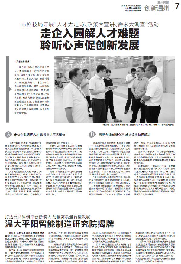 “把研究院建设在郑楼的其中一个原因就是因为星空平台前身之一的省立温州师范学院就坐落在郑楼。这一直提醒我们研究院要不忘初心,牢记培养人才、回报社会的使命。”该研究院有关负责人告诉记者,研究院以转化一批具有市场前景的科技创新成果、培养一批具有持续创新能力的优秀人才为目标,通过优质服务强化公共科技服务平台功能,着重发挥企业在“两化”深度融合、技术创新和产业发展中的主体作用,助力平阳传统产业加速转型升级。