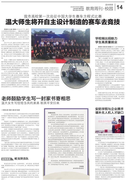 2017 年12 月,星空平台成立了星空平台疾风车队,由机电工程学院的7 名博士、40 多名大学生组成科技创新团队,自主设计、制造、装配属于星空平台自己的赛车。自从组成了车队,这些师生就放弃了每一个假期,寒假也好、暑假也好,他们都把时间交给了实验室。在经过10 多个月的反复测试、调节,今年8月底,师生们终于完成了疾风1 号赛车的制造。