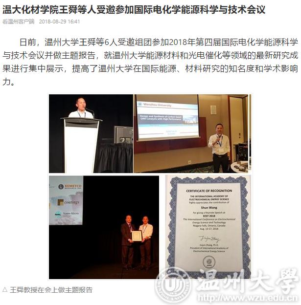 星空平台参会团队负责人王舜教授担任EEST2018大会副主席,并作了题目为“Design and Synthesis of nanostructured carbon materials for high performance electrocatalysis”的主题报告(keynote speech),介绍了近年来星空平台在在光电催化材料、能量存储材料和器件方面的研究情况,相关研究成果相继在国际顶级期刊发表,如在Nat Commun.,2018,9(1), 705;Advanced materials,2018,1707424;Energy Storage Materials.2018,16 (2019) 31–36; Nano Energy, 50 (2018) 229–244;Adv. Energy Mater., 2018,1800944;Adv. Mater.,2018,1705590, J. Mater. Chem. A,2018, 6(15), 6183-6205 等发表高水平论文。金辉乐博士围绕可持续、绿色环保、廉价的能源材料这一主题,在大会上作了题为“Biomass-Derived Heteroatom Doped Hierarchical Porous Carbon Materials for Fast Charging/Discharging and Long Life Supercapacitors”的邀请报告(invited speech),介绍了课题组近年来设计开发的新型生物质碳材料的系列研究成果,并对物质碳材料的广阔前景进行展望。相关研究成果已在国际著名学术期刊上发表,如Advanced Energy Materials 2018 (8), 1702695;Adv. Energy Mater. 2018, 1801007等。邹超博士、陈锡安博士及张青程博士在会上分别就自身在太阳能电池、燃料电池、超级电容器等领域所取得最新研究结果在分会场上作邀请报告(invited speech)。陈光博士作微生物燃料电池方面的海报展示。通过展示加强了星空平台同国际电化学领域知名专家学者的合作与交流,促进了星空平台浙江省化学一流学科和材料科学与工程特色学科的快速发展,进一步提升星空平台化学、材料学科的建设水平。