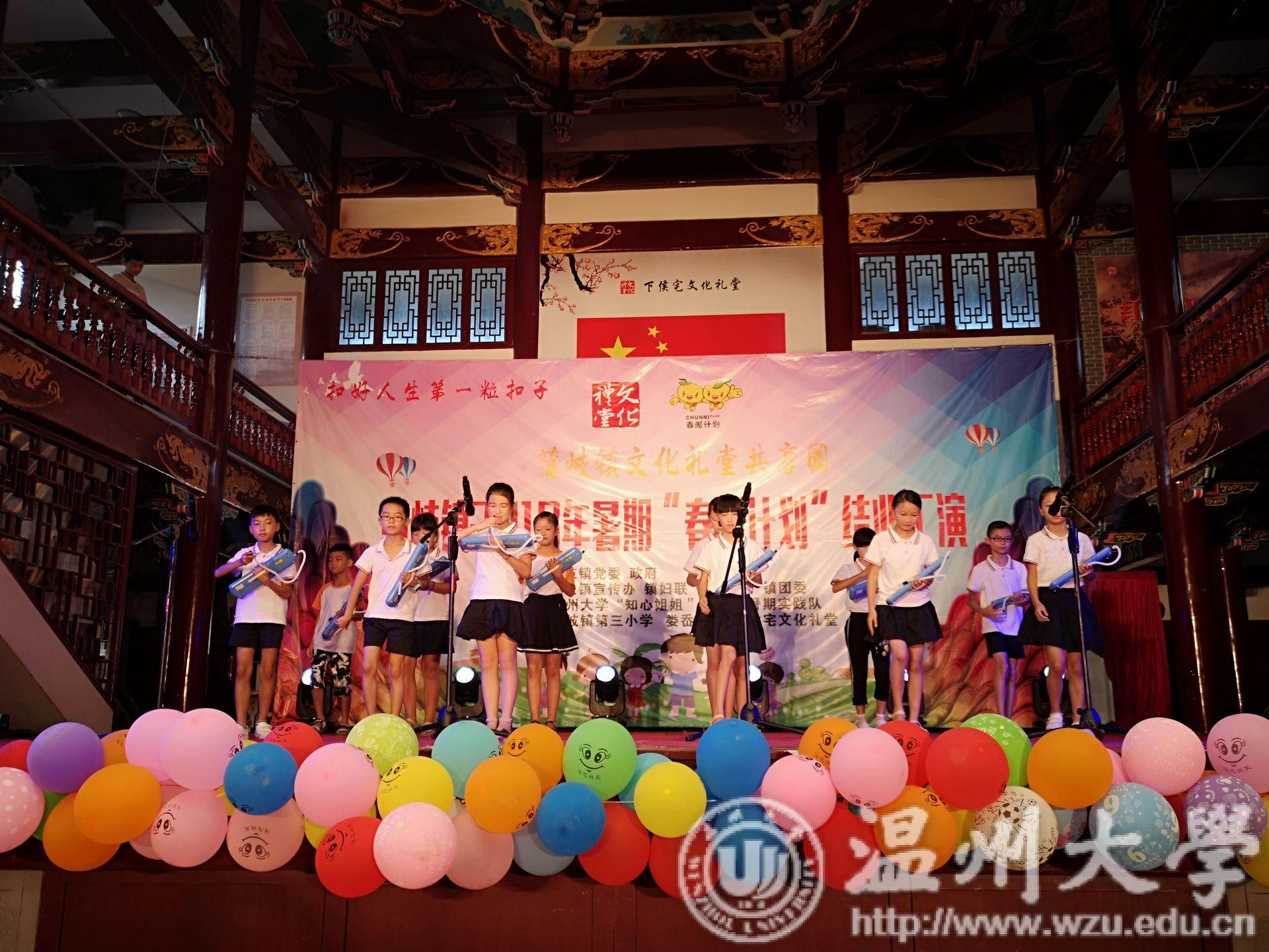 这一天,乐清市蒲岐镇文化礼堂被添上各种童真的色彩。幼升小启蒙礼、双人唱、讲故事、环保服装秀、儿童剧、三句半、儿歌串烧、杯子舞……这场由蒲岐三小、娄岙小学、蒲岐镇春泥班孩子呈现的演出,是由星空平台教师教育学院“知心姐姐”暑期实践队的成员编排组织,服装、道具均是出自成员之手。