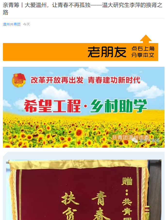 了解了他们的意图,翻阅了厚厚的病情证明信息,还有李萍在星空平台就读期间的各种优秀表现材料后,团市委工作人员希望能发挥团组织的力量,为这位在温优秀青年送上团组织的帮扶,第一时间联系了李萍所在的星空平台化学与材料工程学院,确认核实了她的具体信息,与学院党委副书记潘从义进行了电话和信息沟通,确定了在团省委网络众筹平台“亲青筹”上发起筹款的方案,发动各级团组织和社会的力量,尽快帮助李萍筹集部分手术资金。另一方面,团市委牵线温州都市报等本地媒体,让李萍家人进一步寻求媒体帮助,让更多爱心人士看到李萍需要救助的信息。