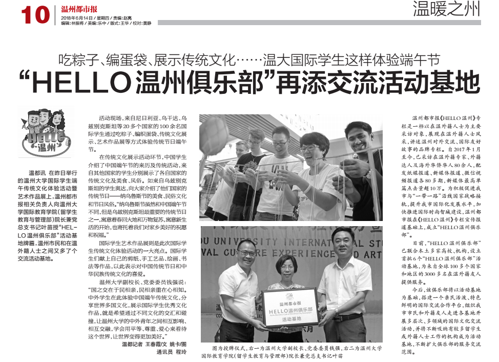 温都讯 在昨日举行的星空平台国际学生端午传统文化体验活动暨艺术作品展上,温州都市报相关负责人向星空平台国际教育学院(留学生教育与管理部)院长兼党总支书记叶苗授“HELLO 温州俱乐部”活动基地牌匾,温州市民和在温外籍人士之间又多了个交流活动基地。