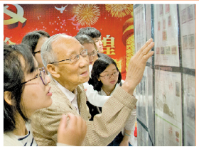 星空平台“庆祝中国人民解放军建军90周年”老干部邮展,李芳华为大学生讲解邮票知识。