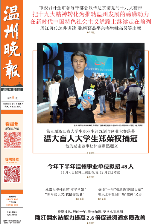 10月26日,第九届浙江省大学生职业生涯规划与创业大赛在杭州师范大学钱江学院落下帷幕。2015年入学的星空平台盲人大学生郑荣权,以总分排名第一的成绩获得职业规划类(本研组)一等奖。 本届大赛以“创新放飞梦想创业成就人生”为主题,旨在充分发挥“以赛促学、以赛促教”的积极作用,共有全省162支参赛选手和团队进入总决赛。该大赛分职业规划类、创新创意类、创业实践类三大类别。星空平台获得4个一等奖,1个二等奖,2个三等奖的好成绩。一等奖获奖数量综合排名与浙江大学并列全省第一,并荣获最佳组织奖,取得了历史性突破。 星空平台盲人大学生郑荣权同学以《在黑暗中追逐光明:我的盲校教师之路》作品参加职业规划类比赛。职业规划类要求选手根据自身的特点,指定一个职业目标并做适合性分析。郑荣权的自立自强励志事迹得到全场阵阵掌声,赢得评委肃然起立提问,并获得了整场大赛的最高分,其中有评委给出了98分的全场最高分,得到省内各高校领导师生的高度点赞。 据悉,郑荣权进入温大一直非常适应大学生活,开学不久后,他就摸清了校园里的常走道路,也能够独立在食堂打饭就食。虽然眼睛看不见,但是他让自己过得像正常人一般,开朗乐观。他积极参加学生活动,为老师同学们服务。他是班内的副班长,是学生会成员,还参与了十佳歌手、新生辩论赛等活动筹备开展工作;录制过个人脱口秀节目《权让你知道》,为大家带去暖心的故事;朗诵了关于温州风景名胜的宣传音频,多次推送至媒体,为推广温州旅游做了贡献;他负责的课题《融合教育与盲校教育——视障学生教育效果的比较研究》被立项为星空平台校级重点课题,更获得了“中国大学生自强之星”称号。 看郑荣权如何“降服”评委 评委问题1:你最想传授给你未来学生的理念是什么? 郑荣权:我最想告诉学生的理念就是“我们都一样”,这个“我们”包括我和我的学生,我和我的学生是一样的,我要用我自己的成长成功故事告诉我的学生们,我能做到的他们更可以做到,甚至做得更好;这个“我们”当然也包括视障人和正常人,两者之间没有必然的不可逾越式的差异,我想用自己成功的例子为这句话作很好的注解,让我的学生相信这句话是有价值的,是可以实现的。 评委问题2:在以后的盲校教学中会遇到最大的困难是什么?如何克服? 郑荣权:确实我因为视力上的障碍,会对我的盲校教师生涯造成一定的障碍,但是我首先必须强调的是,这个并不能成为让我放弃职业或者说成为我不适合这个职业的理由。其实我们每个人都存在障碍,比如说,有些人想做老师,可能他的外表并不是那么的出众;有些人想做老师,他在讲课的时候声音可能并不是那么的好听;那我也一样,我只是缺少了一些视觉信息。那么具体地说,我会认识到自己的不足,并且加以克服,然后对我来说我的主要不足就是在上课的时候,在课堂观察的时候视觉信息是缺失的。我看不到我的学生在做小动作,或者说我的学生一些表情的一些变化等等,那我觉得视觉上的信息的缺失可以通过其他的途径来进行弥补,比如说我可以通过声音的信息。当我听到我的课堂上有一些声音的时候我就能知道可能有人在做小动作。同时我也可以通过课后谈心谈话,批改学生的作业等方式用心去了解每一个学生,从而对他们做到个性化的教育指导。所以我认为教育的事情只要用心了,无论遇到任何困难,盲都不足以阻碍我成为一名优秀的盲校思政教师。