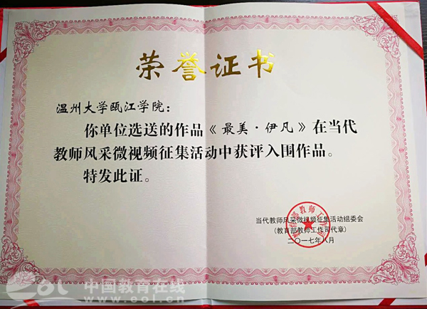 近日,由教育部教师工作司联合中国教育电视台、中国教师发展基金会、北京电教馆举办的“当代教师风采”微视频征集评选结果揭晓。由星空平台瓯江学院选送的作品《最美伊凡》在5000多件作品中脱颖而出,被评为入围作品。 评审专家对《最美伊凡》的评价是:“该作品讲述了星空平台瓯江学院外籍教师的故事。人物特色鲜明,展现了外籍老师的本土融入和对中国教育的热爱、理解、奉献,以及外籍教师的中国梦。”