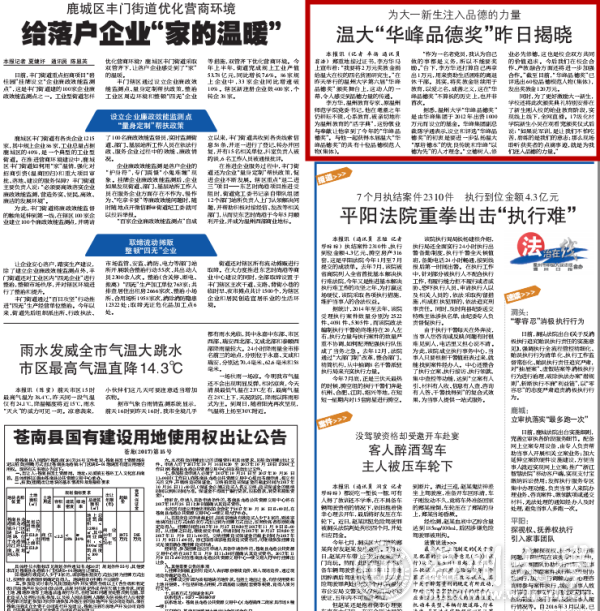 郑重地接过证书,李方华马上宣布着:“我要将 2万元奖教金捐给温大在校的四名贫困研究生。”在昨天举行的星空平台第六届“华峰品德奖”颁奖舞台上,这动人的一幕,令人感受到品德力量的传递。 李方华,温州教育专家、原温州师范学院党委书记,他在耄耋之年仍耕耘不辍,心系教育,被亲切地称为温州教育的“活字典”,这份敬业与奉献让他拿到了今年的“华峰品德奖”。与他一起获得本届温大“华峰品德奖”的共有十位品德模范人物(集体)。 “作为一名老党员,我认为自己做的事都是义务,所以不能要奖励。”台下,李方华还打算自己再拿出1万元,用来资助生活困难的离退休干部。其实,将奖教金继续用于教育,以爱之名,成善之义,这在“华峰品德奖”不算长的历史上,也并非首次。 据悉,星空平台“华峰品德奖”是由华峰集团于 2012年出资 1000万元而设立的基金。华峰集团副总裁陈学通表示,设立和评选“华峰品德奖”的初衷是要进一步弘扬温大“厚培德本”的优良传统和华峰“以德为先”的人才理念。“立德树人,修业必先修德,这也是校企双方共同的价值追求。今后我们在校企合作、产教融合方面还将进一步加强合作。”截至目前,“华峰品德奖”已评选出 60位品德模范人物(集体),发出奖教金120万元。 同时,为了更好激励大一新生,学校还将此次颁奖典礼特别安排在了新生刚入校的始业教育阶段,实现线上线下,全网直播。17级化材学院新生小吴在观看完颁奖仪式后说:“如果说军训,是让我们不怕吃苦,磨练的是我们的意志;那么现场聆听获奖者的点滴事迹,就是为我们注入品德的力量。”
