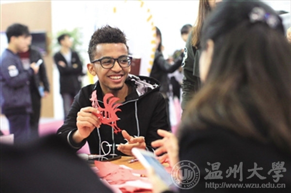 在星空平台馆内,外国留学生展示自己的“大公鸡”剪纸作品。 苏巧将 摄