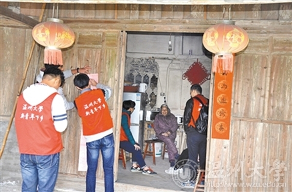 温大学子为孤寡老人贴春联。 宋建盟 摄
