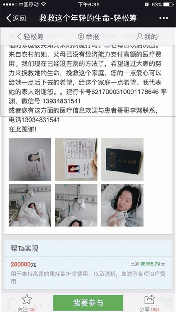 1月23日,李萍在火车站候车,准备回家过春节。她突然呼吸困难,很快进入半昏迷状态,周边群众随后拨打120求助。医生诊断,李萍是由于突发性肾功能衰竭引发肺部重度感染和心脏衰竭。经过抢救,李萍暂时脱离了生命危险。但每天1.5万元的医疗费用,很快消耗完她家的所有积蓄,后期巨额的医疗费用,让李萍家人一筹莫展。在亲友的劝说和帮助下,她的家人开始通过网络求助。