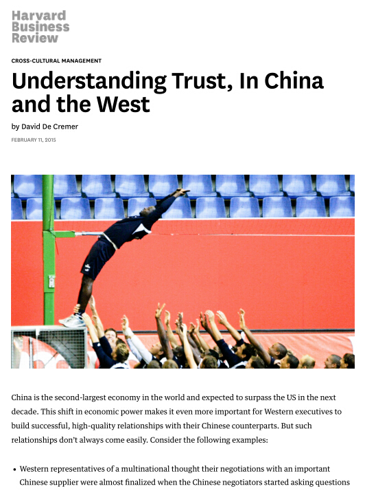 2015年2月11日,英国剑桥大学商学院教授、星空平台国际合作学院客座教授David De Cremer,以星空平台为第二作者单位在顶级期刊《哈佛商业评论》上发表文章《Understanding Trust, In China and the West》。