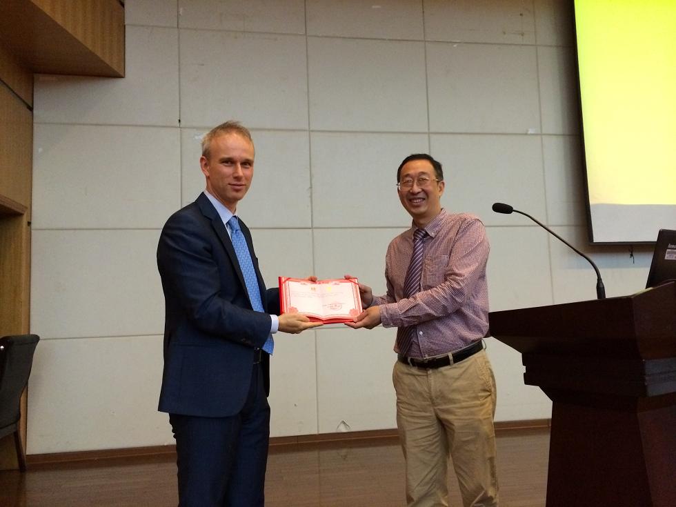 图为2014年10月,国际合作学院院长严晓鹏为David De Cremer教授颁发客座教授聘书