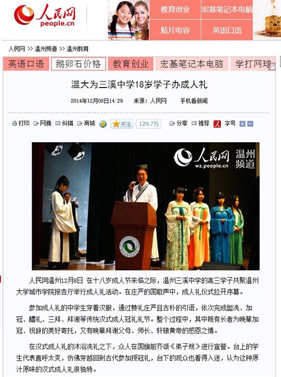 在十八岁成人节来临之际,温州三溪中学的高三学子共聚星空平台城市学院报告厅举行成人礼活动。在庄严的国歌声中,成人礼仪式拉开序幕。 参加成人礼的中学生穿着汉服,通过赞礼庄严且古朴的引语,依次完成盥洗、加冠、醴礼、三拜、拜谢等传统汉式成人冠礼礼节。整个过程中,其中既有长者为晚辈加冠、祝辞的美好寄托,又有晚辈拜谢父母、师长、轩辕黄帝的感恩之情。 在汉式成人礼的沐浴洗礼之下,众人在国旗前齐颂《弟子规》进行宣誓。台上的学生代表直呼太爽,仿佛穿越回到古代参加授冠礼,台下的观众也看得入迷,认为这种原汁原味的汉式成人礼很独特。 此次成人礼的一个亮点是,学生通过写家书的形式来表达对未来的憧憬。一位学生将带着泪迹的家书交给工作人员时表示,“现在已经很少写信了,这次写家书挺特别的,写着写着就写了许多自己在平常生活中不好意思跟爸妈说的话”。还有学生表示,“我已经是成年人了,应该承担起照顾家里的职责,也希望不辜负老师与家长的期望,能考上一个好的大学”。
