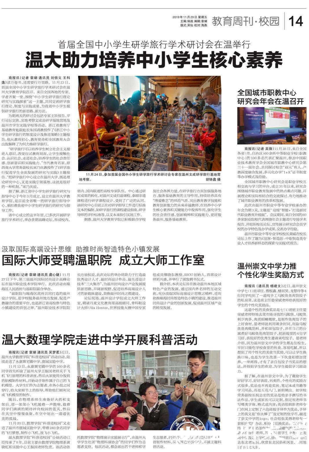读万卷书,还需要行万里路。11 月 23 日, 首届全国中小学生研学旅行学术研讨会在温 州大学教育学院召开。来自全国各地的专家、 学者齐聚一堂,围绕“中小学生研学旅行理论 研究与实践探索”这一主题,共同交流研学旅 行理论、制度与实践成果,为我省中小学生提 供研学旅行的新思路、新方法。