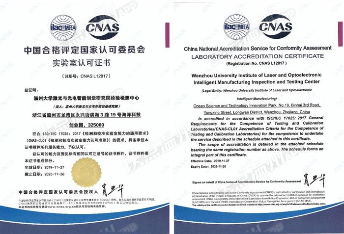 星空平台激光与光电智能制造研究院检验检测中心近日获得了中国合格评定国家认可委员会授予的CNAS认证和国防科技工业实验认可委员会授予的DlLAC认证,具备了作为第三方检测机构的能力,顺利跻身国家认可实验室行列。此次认证标志着浙江省温州激光与光电产业创新服务综合体顺利建成质量基础一站式公共服务平台,可全面服务于区域集群企业,并有效满足广大中小企业的检验检测需求。