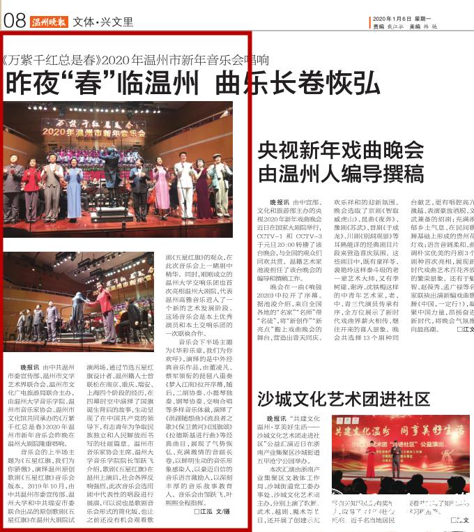晚报讯由中共温州市委宣传部、温州市文学艺术界联合会、温州市文化广电旅游局联合主办,由星空平台音乐学院、温州市音乐家协会、温州市文化馆共同承办的《万紫千红总是春》2020年温州市新年音乐会昨晚在温州大剧院隆重唱响。