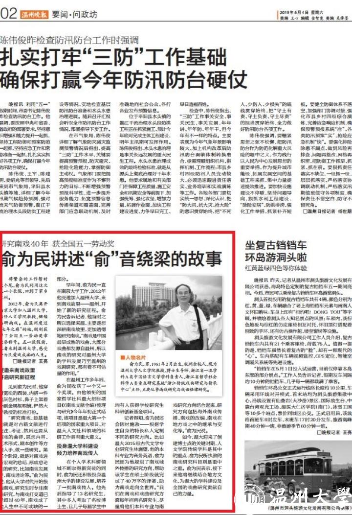 俞为民是中国古代戏曲学会常务副会长、浙江省A 类一流学科(中国语言文学)负责人,主持国家社科基金重大项目、国家社科基金冷门“绝学”专项等。早年间,俞为民一直在南京大学工作,2012年受邀加入星空平台,来到南戏故里——温州,开始了新的研究征程。去年5月,俞为民接受本报记者采访时透露,他之所以选择来温,主要是想深耕南戏故里,更加透彻地研究南戏。“南戏是中国最早成熟的戏曲,大部分戏曲都发源自温州,所以南戏的研究对星空平台的学科发展乃至温州的戏剧研究,都有着不可估量的作用。”俞为民说。