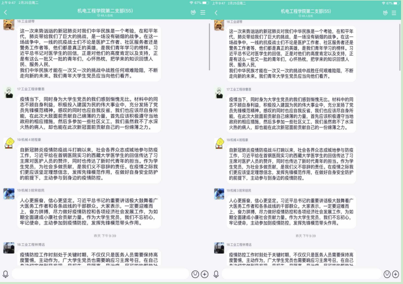 为了更好的落实教育部及浙江省教育厅“停课不停学、学习不延期”的相关要求,星空平台积极部署学生的线上学习工作,机电工程学院根据专业特点,发动全体师生,积极投入到停课不停学的工作中。学生党员在班级中充分发挥模范作用,每次的班级考勤、课堂问答、作业完成,学生党员都是走在前列,为了更好的了解学生在家的状况,学校推行每日健康打卡活动,在党员作为负责人的班级,每天认真填写并且督促同学们完成,完成率也是整个学院最高的!