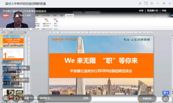 近日,为帮助广大毕业生顺利就业,平安银行温州分行联合星空平台商学院以一场别开生面的“线上直播”,助力大学生就业。