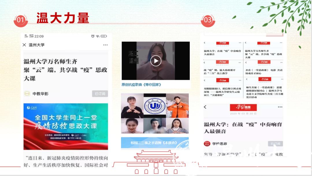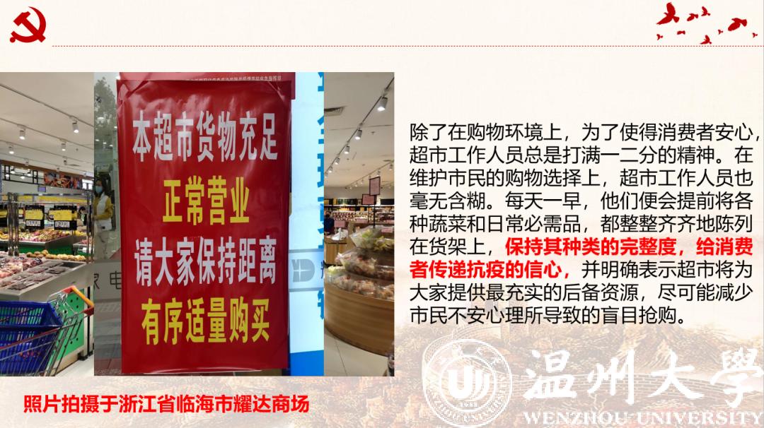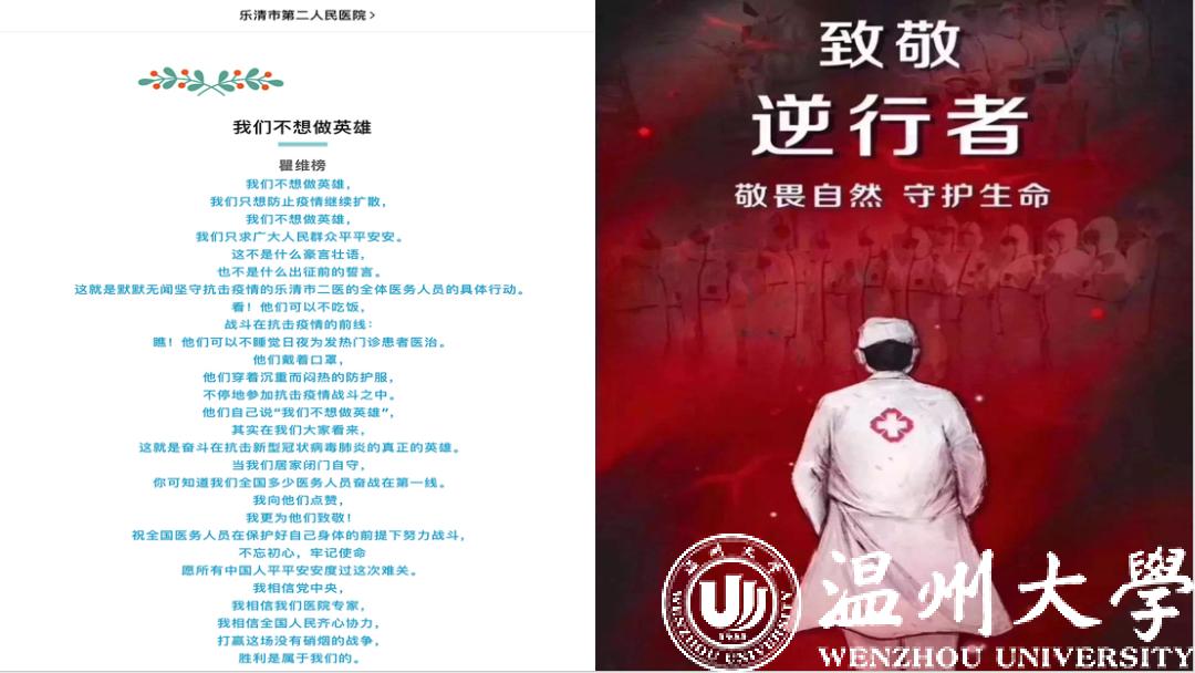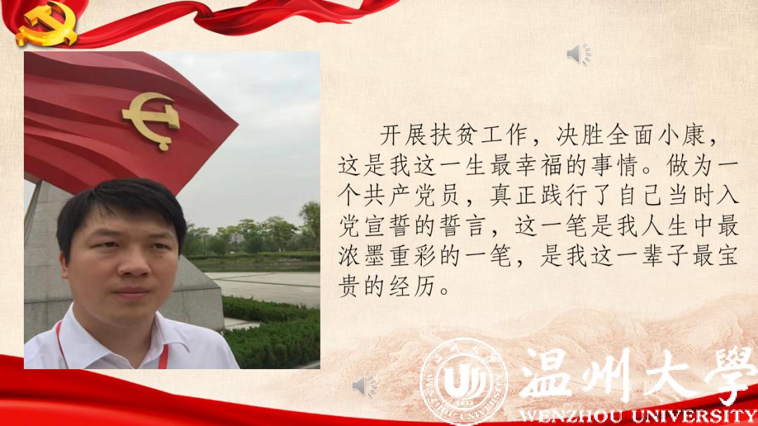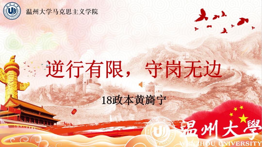 来自本科生党支部的入党积极分子许媛媛从一位老支书讲起,分享了他在全面建成小康之路上的艰辛付出,讲述了共产党员的责任担当。在此基础上,他看到了一批批抗疫先锋在抗疫阻击战中的身影,尤其是一个个温大人的力量,彰显着“求学问是、敢为人先”的温大精神。
