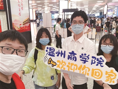 该校金融贸易学院2019级金融学专业的刘杨和田旭,两人家都在贵州铜仁,同时还是少数民族学生,两人相约一起出发,经过8个多小时的动车行程,于5月12日晚上10点左右到达温州火车南站。刚一出站,该学院的辅导员蒋柜杨和任课老师郭碧港就在出口处迎接她们。“原本以为这么晚到温州应该没大巴车了,我们两个女生还想着等会儿一起打车回学校,没想到学校考虑得这么细致周到。”刘杨同学感动地说道。