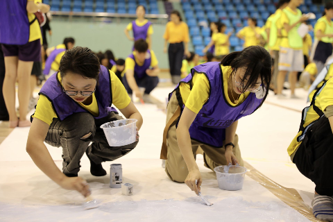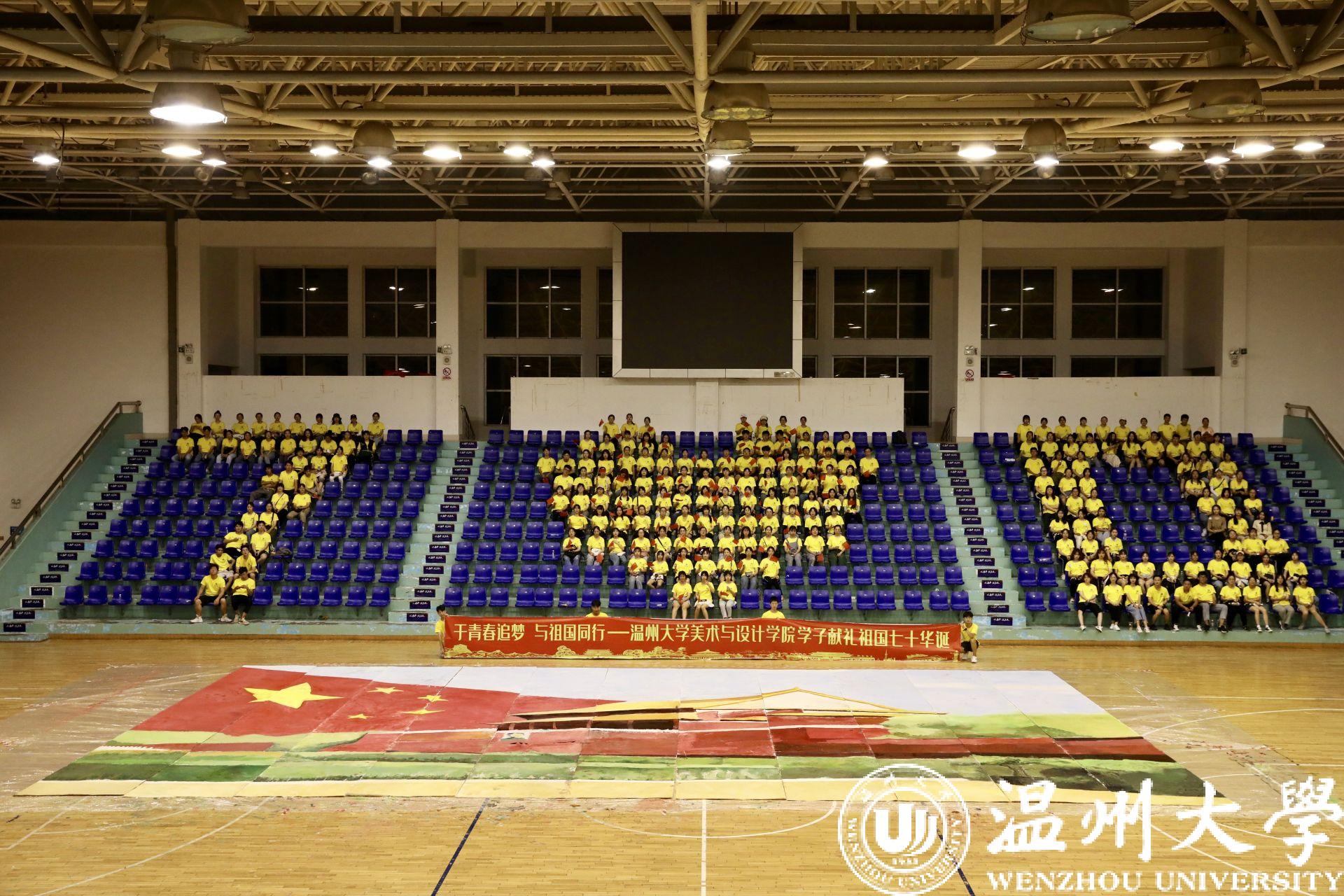 随后,266名新生齐聚温大篮球馆,在星空平台这个崭新的起跑线上,他们用手中的颜料与画笔,用艺术专特长与热情,共同绘制10*16m国庆主题巨画《我爱祖国》,画出了浓墨重彩的一笔。最后,在266人、花费3小时共同完成的画作旁,全体新生摆出“70”字样,齐声喊出“祝伟大祖国繁荣昌盛”,献礼祖国70华诞,展现了温大青年学子的爱国情怀和使命担当。