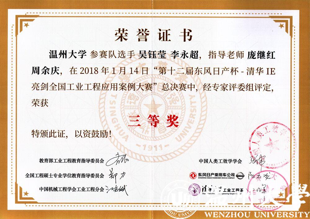 “工业工程专业创新实践了‘创-用’融合的学生科技创新能力培养方式。”温大机电工程学院副院长姜锐补充介绍,该专业非常注重学生的实践和创新能力培养,给学生提供了丰富的自我价值实现途径。如以创新到创业、创新转应用的“创-用”融合为导向,形成学生参与校企项目、创新创业训练实践和学科竞赛等多元形式的创新能力培养体系。2018年1月,该专业学生吴钰莹和李永超参加全国工业工程应用案例大赛,最终荣获三等奖,同台竞赛者包括清华大学、上海交通大学、华中科技大学等知名高校的学生。该项赛事是目前国内工业工程领域最具影响力的比赛。