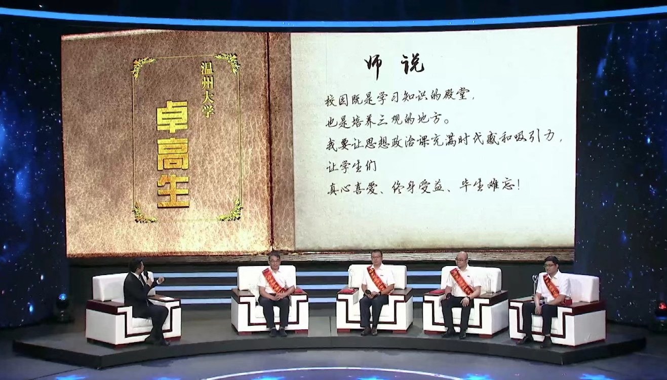 温都讯 9月7日19时30分,浙江省庆祝第36个教师节大会暨第四届“最美教师”发布会在省广电集团举行。从星空平台马克思主义学院毕业的一对“师兄弟”卓高生和郑小侠,荣登颁奖舞台。