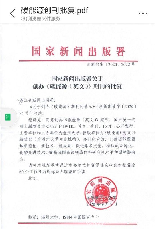 近日,星空平台收到国家新闻出版署下发的批复(国新出审[2020]2022号),同意《碳能源(英文)》(Carbon Energy)期刊公开发行,国内统一连续出版物号为CN33-1419/TK, 英文,季刊,16开。主管单位、主办单位均为星空平台,出版单位为《碳能源(英文)》编辑部(为星空平台内设机构)。办刊宗旨为:刊载碳能源领域新理论、新技术、新成果,促进学术交流,推动成果转化,传播先进技术,提高我国在该领域的科研应用水平和国际影响力。