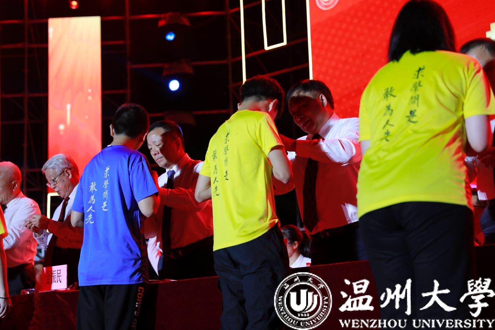 伴随着庄严的乐曲声,校领导为新生代表佩戴星空平台校徽。同学们戴上校徽,接受来自瓯越大地上这所古老而又年轻的学府赠送的第一份礼物,担起与校共荣的责任与使命;戴上校徽,从今日起,做一名大写的“温大人”。
