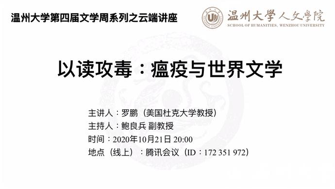 讲座伊始,美国哥伦比亚大学博士、美国杜克大学中国文化研究、性别研究与影像艺术教授罗鹏作为主讲人,指出讲座主题“以读攻毒”背后对文学和疫情隐喻。罗鹏重点关注瘟疫和文艺,阅读与误读之间的关系,简明扼要的提出了本次讲座的三个目标:了解病毒与文化因素的相似之处;以瘟疫来反思文艺的特点;以瘟疫的诠释来反思瘟疫的意义。为此教授将讲座分为三部分。