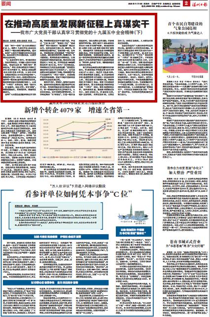 全市广大民营企业党组织掀起学习热潮。华峰集团党委召开专题学习会,并通过“工前20分钟”“餐桌自习室”“流动课堂”等学习载体和“随身党课”微信公众号,组织全体职工深入学、细致学。华峰集团党委副书记、总裁林建一说,近年来,华峰集团党委持续推进“三聚三提”大党建,深化党员传帮带、雄鹰计划、学习型班组、先锋指数进考核等制度,以高质量党建引领高质量发展,集团去年实现营业收入382亿元,在中国企业500强的排名跃升至234位。作为一家民营企业,华峰集团尤为关注全会提出的“坚持把发展经济着力点放在实体经济上”,这为企业的未来发展指明了方向。华峰将把产业科技创新作为“华山一条路”,主动拥抱产业变革新浪潮,坚定不移走好创新效益型现代化企业发展之路。