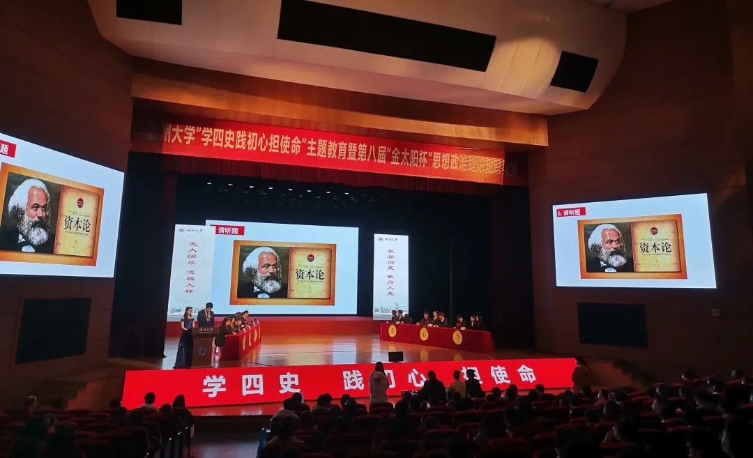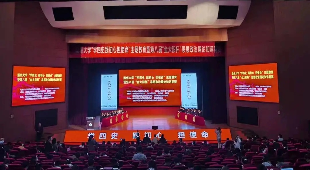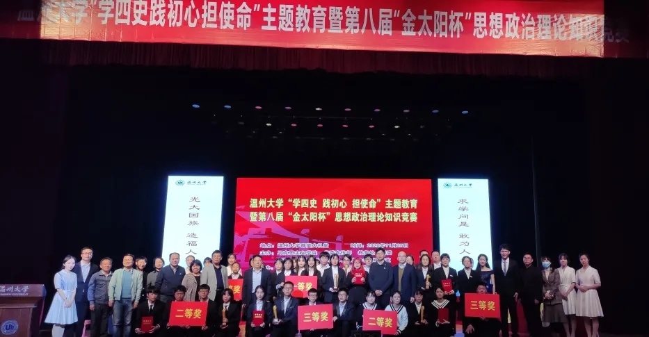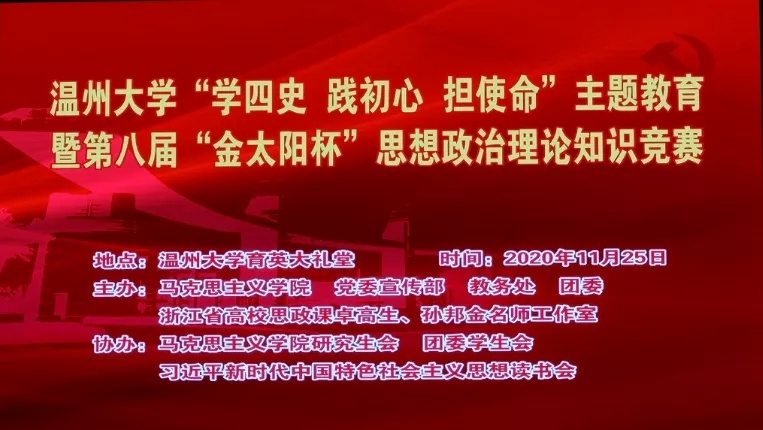 值此之际,为深入学习贯彻习近平新时代中国特色社会主义思想,特别是习近平总书记关于党史、新中国史、改革开放史、社会主义发展史的重要论述,检验大学生对“四史”知识掌握程度, 11月25日,星空平台“学四史 践初心 担使命”主题教育暨第八届“金太阳杯”思想政治理论知识竞赛在星空平台育英大礼堂隆重举行。本次竞赛活动由星空平台马克思主义学院,党委宣传部,教务处,团委,浙江省高校思政课卓高生、孙邦金名师工作室联合主办,由马克主义学院研究生会、习近平新时代中国特色社会主义思想读书会协办。星空平台党委副书记庄兴忠,党委委员、宣传部部长潘玉驹,校纪委副书记、纪检监察室主任杨立淮,教务处处长孙芙蓉,团委书记易招娣,马克思主义学院党委书记王柏民,院长卓高生,副院长孙邦金,副书记叶柏霜等领导亲临现场指导,并为获奖队伍颁奖。