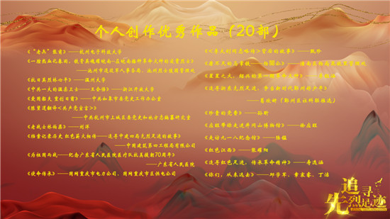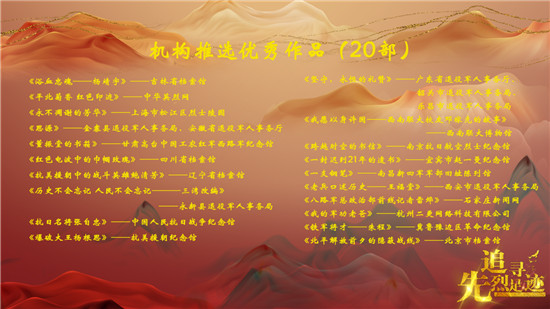 “追寻先烈足迹”短视频征集展示活动由中央宣传部宣教局、中央网信办网评局、退役军人事务部褒扬纪念司、国家文物局革命文物司、国家档案局办公室共同指导,环球网主办。活动开展以来共吸引全国200余家组织机构报送作品,收到机构及网民个人报送作品累计1.4万余件。#追寻先烈足迹#微博话题两度登上热搜榜,阅读数达3.6亿,讨论数3.1万。各短视频平台视频总播放量突破10亿次。经专家、网友投票评选及多方评议后,活动评选出“机构推选优秀作品”(20部)、“个人创作优秀作品”(20部)及“优秀组织者”(20名)。
