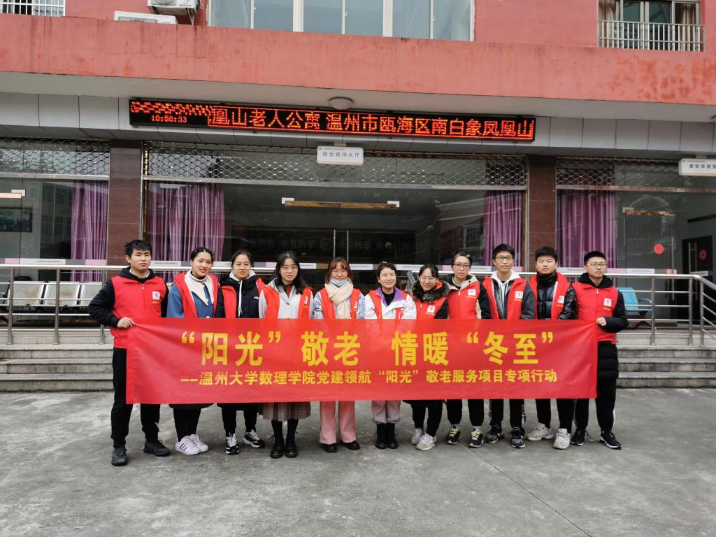为积极践行新时代文明实践,把敬老助老落在实处,融入民心,12月20日上午,冬至来临之际,数理学院师生党员与“阳光”青年志愿者来到南白象老人公寓,开展“阳光”敬老,情暖“冬至”为主题的党建领航“阳光”敬老服务项目专项行动。