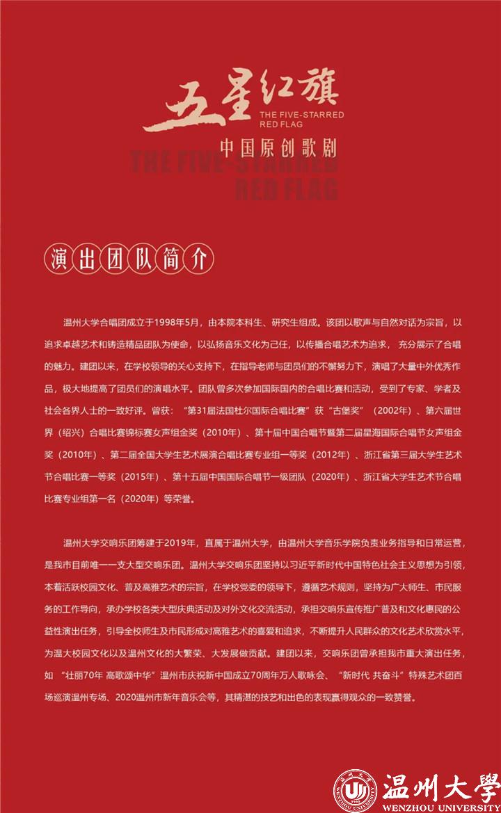 《五星红旗》是国内首部以国旗为题材的歌剧,邀请国家一级作曲家朱嘉禾教授作曲,青年编剧李长鸿担任编剧,中央歌剧院国家一级导演、双“文华奖”获得者王湖泉教授担任导演,著名青年指挥家、钢琴家王燕担任指挥,具有较高的艺术水准。去年10月7日、8日在温州大剧院试演两场,演出取得圆满成功。100多位国内业内知名专家、全市相关部门领导以及群众2000余人现场观看演出。该剧得到专家高度评价,现场观众高度赞赏,引起了社会媒体广泛关注,中国艺术报、学习强国、浙江日报、浙江卫视等国家、省、市级等70余家媒体竞相报道。
