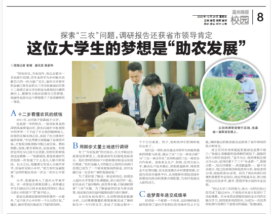 为了更好地了解这一职业和岗位,他便加入星空平台菜篮子队课题组,和小组同学一起,前后走访了温州梅屿、丽岙等乡镇,开始调研探索“三农”问题。为了解最新的信息与务实政策,他还独自前往温州瓯海农商行进行调研。