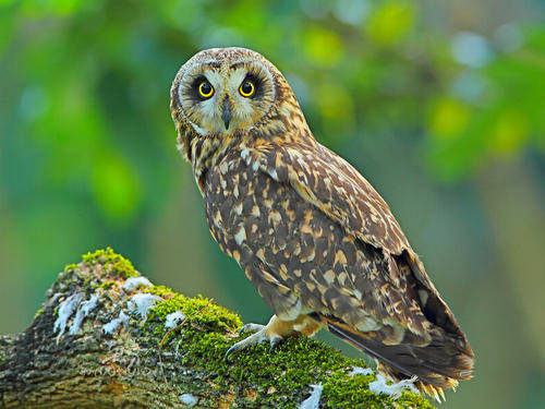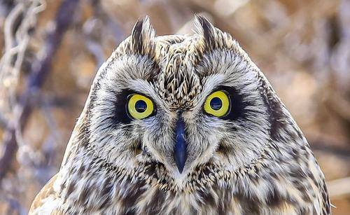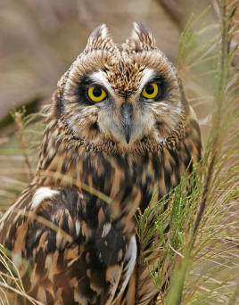 描述:体型(38厘米左右)的黄褐色鸮鸟。翼长,面庞显著,短小的耳羽簇于 野外不可见,眼为光艳的黄色,眼圈暗色。上体黄褐,满布黑色和皮黄色纵纹;下体皮黄色,具深褐色纵纹。飞行时黑色的腕斑显而易见。