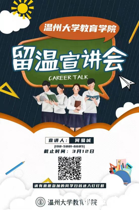 据悉,为更好地吸引人才、留住人才、激励人才、服务人才,在首个温州人才日,星空平台教育学院推出“博雅育师”教师职涯点亮活动,通过“就业支持”“考研帮扶计”“划创业扶持”“专升本护航”“就业援助”五大专项计划,将陆续开展20余项活动,助力温大学子扎根温州,为温州城市的发展注入新活力。